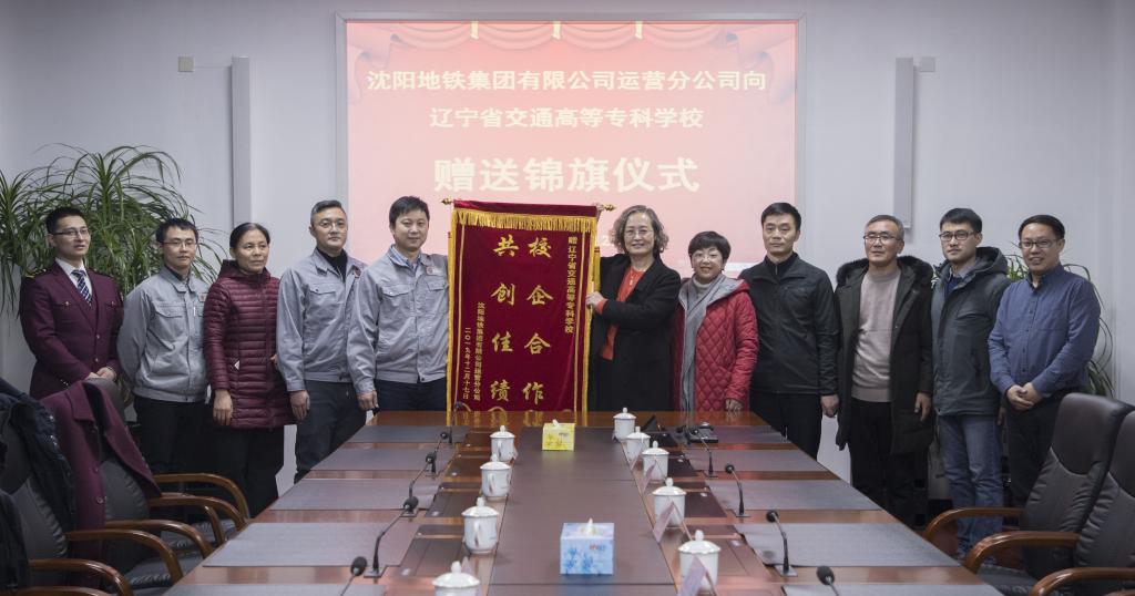 沈阳地铁集团有限公司运营分公司向我校赠送“校企合作,共创佳绩”锦旗
