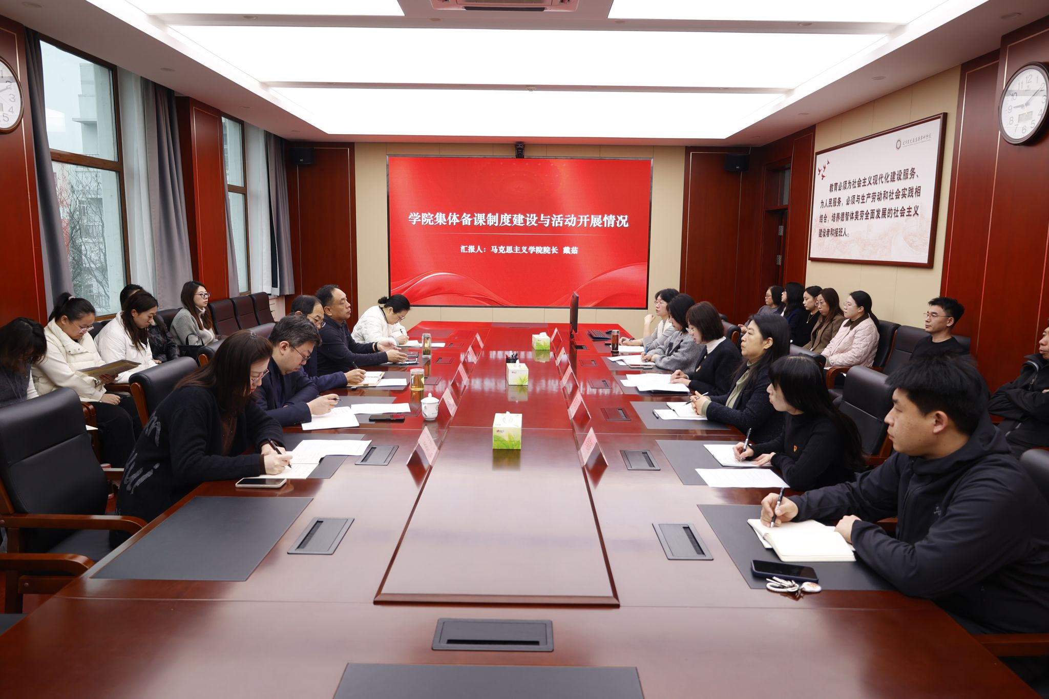 为深入学习贯彻党的二十届四中全会精神,推动党的创新理论有机融入思政课教学,12月19日上午,我校于办公楼301会议室举行“习近平新时代中国特色社会主义思想概论”集体备课会。学校党委书记任冰、校长孙延鹏、副校长王宇出席会议。马克思主义学院领导班子成员、各教研室主任及全体思政课教师参会。会议分阶段由马克思主义学院院长戴茹、副院长兼“习近平新时代中国特色社会主义思想概论”教研室主任王帅乔主持。 集体备课会现场会上,...