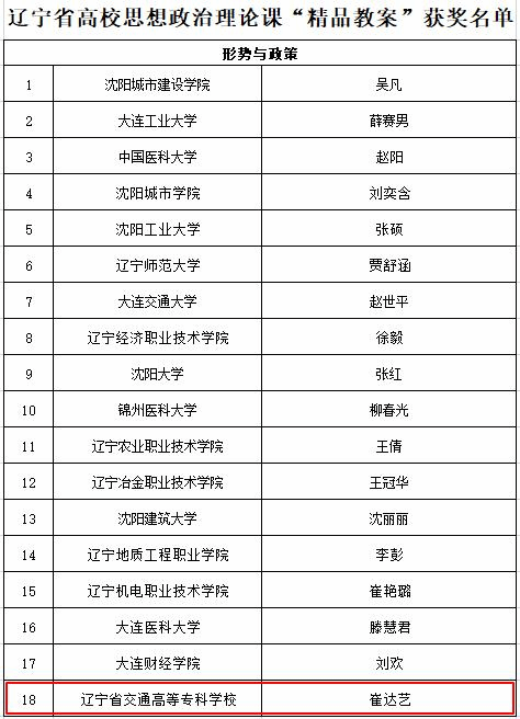 为深入贯彻落实《新时代高等学校思想政治理论课教师队伍建设规定》(教育部令第46号)的要求,用好教材、编好教案、讲好思政课,切实推动教材体系向教学体系转化,不断提升全省高校思想政治理论课教师教学水平,辽宁省教育厅在全省高校组织开展了思想政治理论课“精品教案”评选活动。近日,经专家评审,全省高校共有118人获奖。