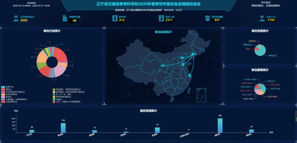 此次招聘会全程采用线上平台开展,毕业生通过我校就业信息网、微信公众等平台可及时查看参会企业名单、公司简介、在招职位等信息。求职双方采用线上宣讲、投递简历、云面试等方式进行沟通。平台中单位收取简历数,各系、各专业学生投递简历情况,面试人数等数据一目了然,实现了企业招聘信息实时更新、后台全程监督管理,方便数据统计并进行双向互动。后期,我校将对此次招聘会数据进行持续跟踪,进一步做好后续服务工作,不断推进线上招聘常态化,全面助力2020届毕业生充分就业。
