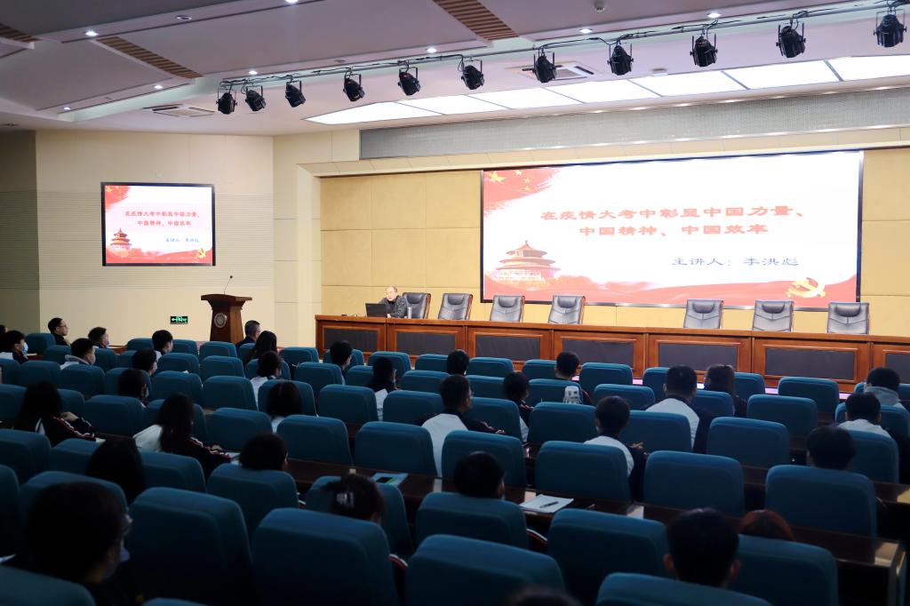 李洪彪总会计师通过丰富详实的资料,分别从中国抗击疫情的艰辛历程、中国抗击疫情的实际行动、中国抗击疫情的大国担当这三个方面讲授了中国在这次抗击新冠肺炎疫情过程中所采取的态度、措施和取得效果,重点阐述了中国共产党领导和中国特色社会主义制度的显著优势,详细分析了我国治理体系和治理能力所展现的无与伦比的独特优势和强大效能,生动诠释了中国人民坚韧奉献、守望相助的民族精神,有力论证了中国以无可辩驳的事实作出的无愧于国际社会的贡献,践行了人类命运共同体理念,从全方位、多角度书写和彰显了中国力量、中国精神、中国效率。最后,李洪彪总会计师通过“党的十九届五中全会为‘后疫情时代’谋篇布局”的讲授,让学生们深刻理解了我国即将全面开启社会主义现代化国家建设新征程,同时也对我们的青年学生提出了殷切期望,要更加坚定马克思主义信仰,树牢“四个意识”、坚定“四个自信”、做到“两个维护”,要认清形势、把握大势、认同优势,高举中国特色社会主义伟大旗帜,认真学习贯彻习近平新时代中国特色社会主义思想,始终坚定不移的沿着中国特色的社会主义道路前进,为全面建成社会主义现代化国家,实现中华民族伟大复兴的中国梦而不懈奋斗。