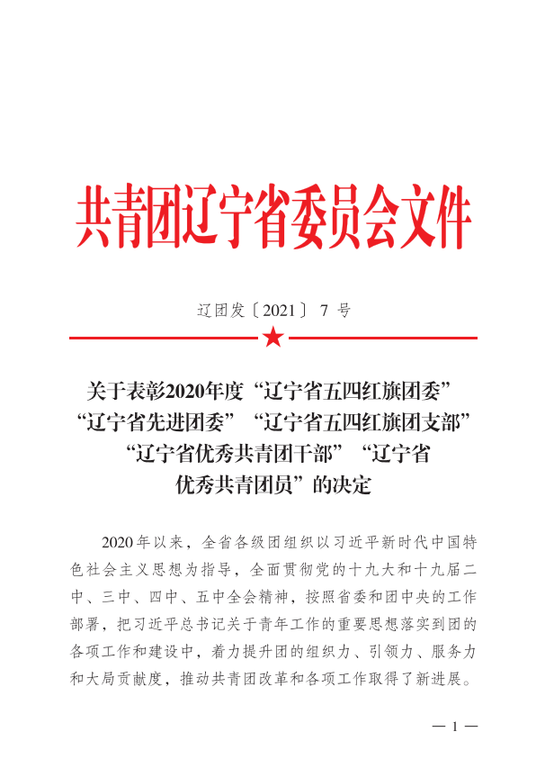 近日,共青团辽宁省委员会公布《关于表彰2020年度“辽宁省五四红旗团委”“辽宁省先进团委”“辽宁省五四红旗团支部”“辽宁省优秀共青团干部”“辽宁省优秀共青团员”的决定》(辽团发【2021】7号),表彰2020年度表现突出的团组织、团干部和广大团员。全省共有14所本、专科高校团委、8所高校基层团支部位列其中。我校团委荣获“辽宁省先进团委”荣誉称号,管理工程系会展策划与管理专业18-2团支部荣获“辽宁省五四红旗团支部”荣誉称号,道路与桥梁工程系赵泽政荣获“辽宁省优秀共青团员”荣誉称号。
