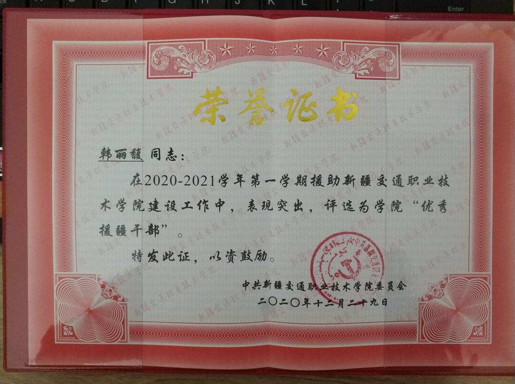 一段援疆路,一生援疆情。韩丽馥老师时刻不忘党员初心,始终牢记党员使命,以高度的思想站位和责任担当,圆满完成了援助新疆交职院的建设工作,为新疆交职院发展贡献了个人力量,被新疆交职院党委授予了“优秀援疆干部”荣誉称号。