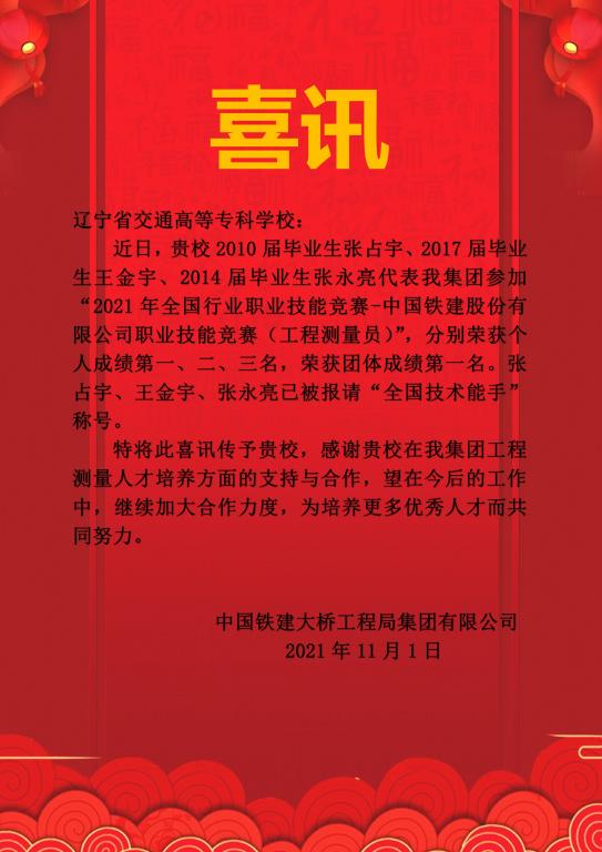2021年11月1日,中国铁建大桥工程局集团有限公司向我校发来喜报,我校毕业生2010届工程测量技术张占宇、2017届工程测量技术专业王金宇、2014届工程测量技术专业张永亮代表中国铁建大桥工程局集团有限公司参加“2021年全国行业职业技能竞赛—中国铁建股份有限公司职业技能竞赛(工程测量员)”,分别荣获个人成绩第一、二、三名,荣获团体成绩第一名。张占宇、王金宇、张永亮已被报请“全国技术能手”称号。