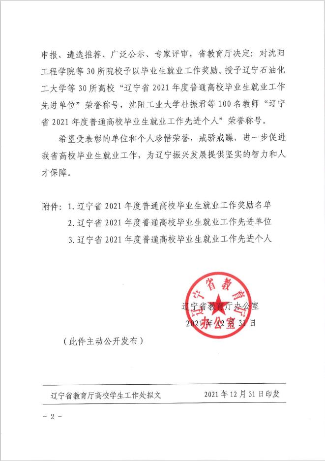 近日,辽宁省教育厅办公室印发了《关于2021年度普通高校毕业生就业工作奖励及表彰就业工作先进单位和先进个人的通知》(辽教办[2021]484号),我校荣获“辽宁省2021年度高校毕业生就业工作奖励一等奖”、“辽宁省2021年度普通高校毕业生就业工作先进单位”两项殊荣,汽车系党总支书记惠有利同志被授予“辽宁省2021年度普通高校毕业生就业工作先进个人”荣誉称号。