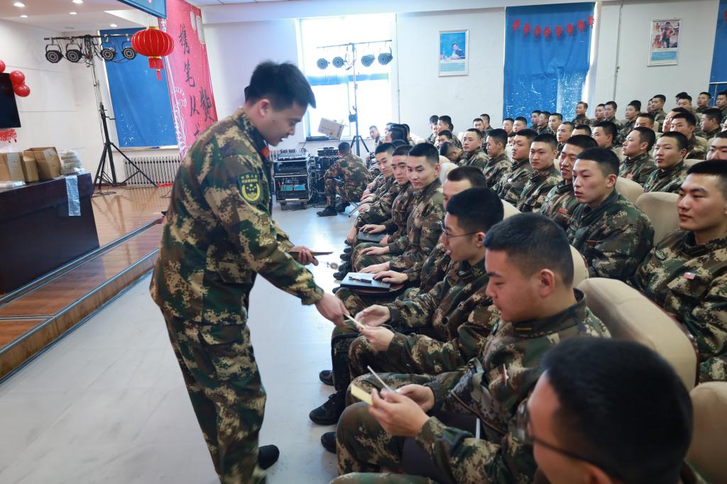 1月29日,在锦州新兵连随队集训唐教官为每名士官学子分发了春节纪念品,同学们收到了来自母校的牵挂和祝福。