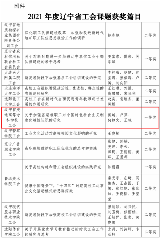 近日,辽宁省总工会发布了《关于2021年度全省工会课题评审结果的通报》,其中由我校马克思主义学院侯越、卢萍、何静文、王艳老师主持申报的《关于加强基层教职工对中国特色社会主义制度优越性认识的研究》课题喜获一等奖。