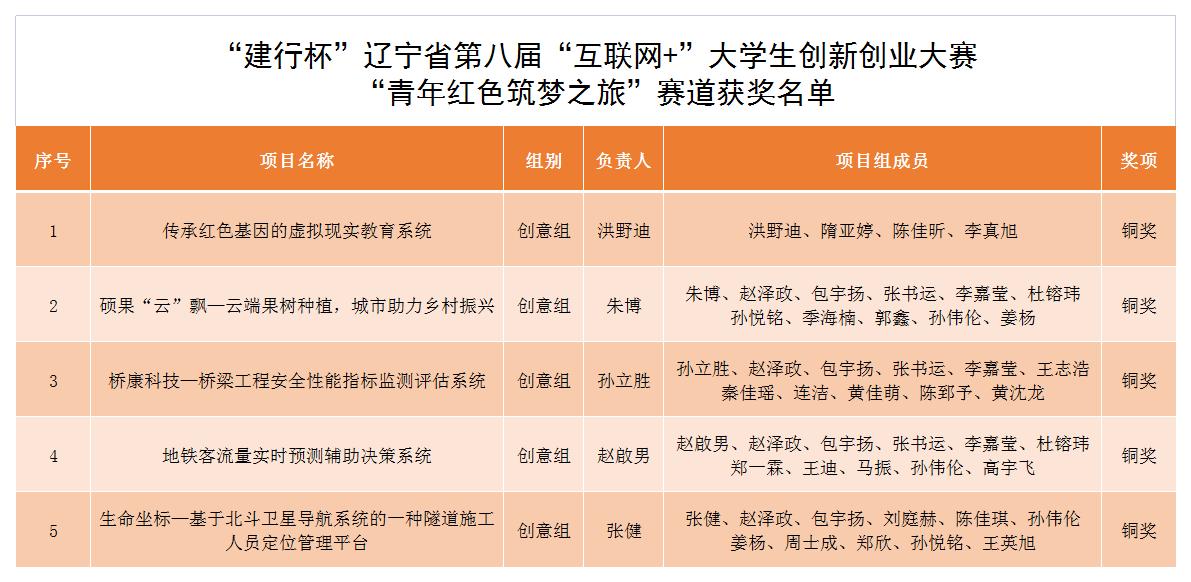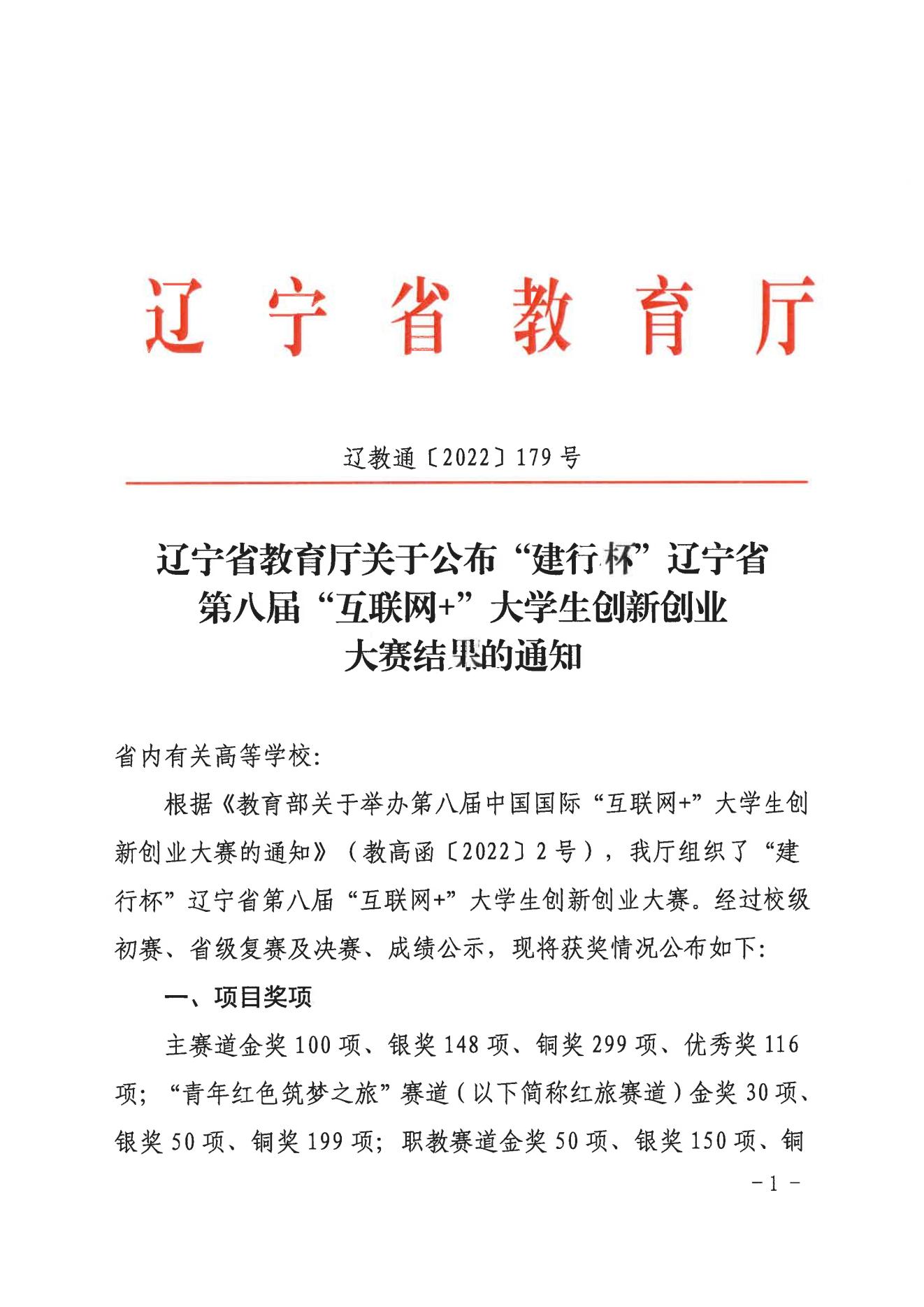 近日,“建行杯”辽宁省第八届“互联网+”大学生创新创业大赛决赛落下帷幕,本届比赛共有省内95所高校的90226个项目报名参赛。经过激烈角逐,我校共有53个项目在本届大赛中获奖,创历史新高。其中“职教赛道”荣获金奖5项、银奖16项、铜奖26项,“青年红色筑梦之旅赛道”荣获铜奖5项,产业赛道荣获银奖1项;11名教师荣获“优秀指导教师”;我校因承办职教赛道赛事组织有力有效、比赛成绩优异,荣获“突出贡献奖”、“优秀组织奖”。