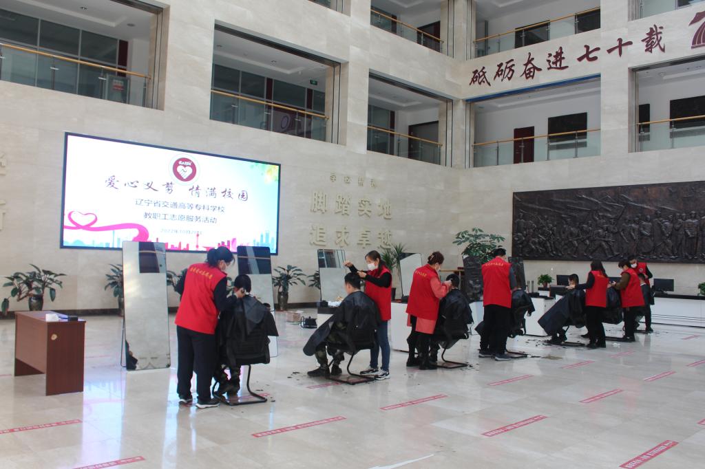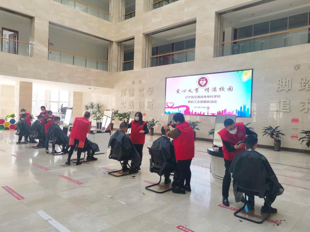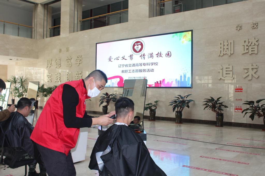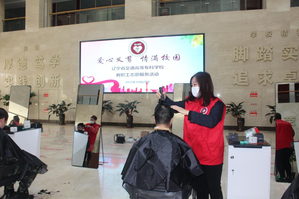 2022年10月28日下午,我校工会在学生素质教育中心一楼大厅组织开展了“爱心义剪 情满校园”教职工义务理发志愿服务活动,为士官班的同学们义务理发。