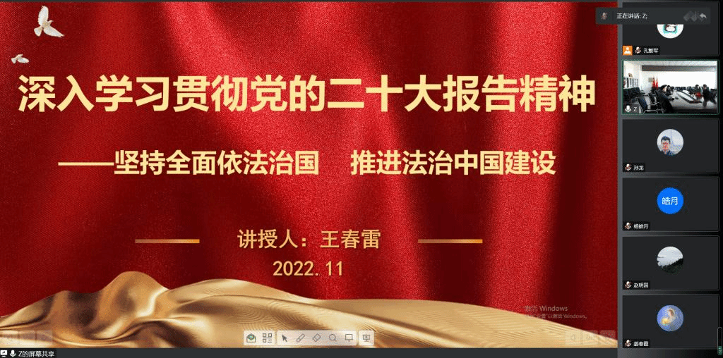 11月26日,为进一步学习宣传贯彻党的二十大精神,进一步引导广大党员加强对党的二十大精神的学习,王春雷副校长在A712会议室,通过线上与线下相结合的方式,为轨道交通工程系党总支的全体教工党员上题目为《深入学习贯彻党的二十大报告精神—坚持全面依法治国、推进法治中国建设》的党课。
