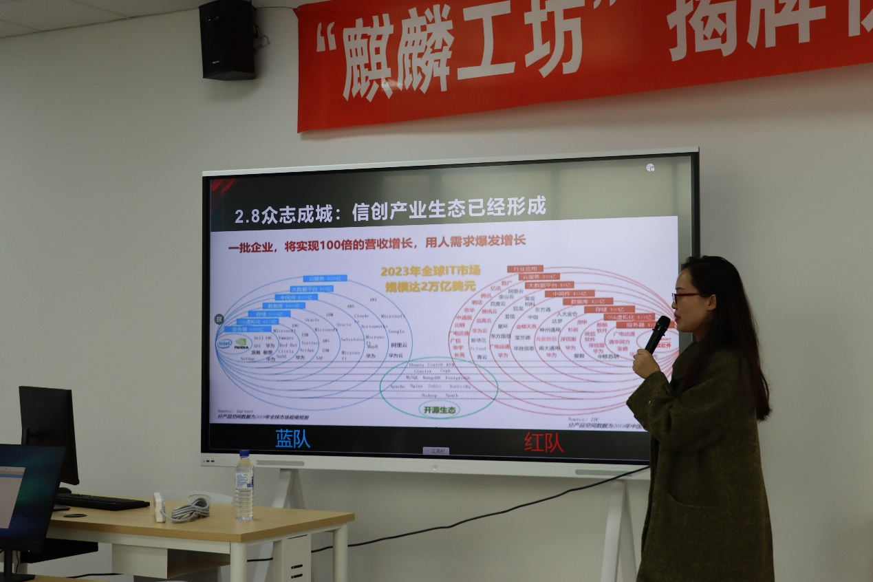 随后,麒麟软件有限公司教育行业总监贾文燕女士做了《信创发展现状及趋势》的主题演讲。此次演讲,现场效果十分精彩,学生们收获很多,极大地促进了学生们对国产信创产品的学习热情和国产信创事业的支持。