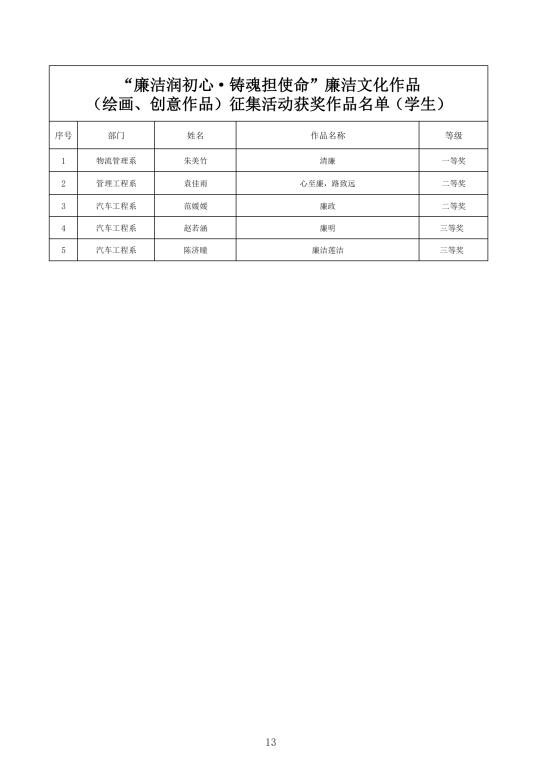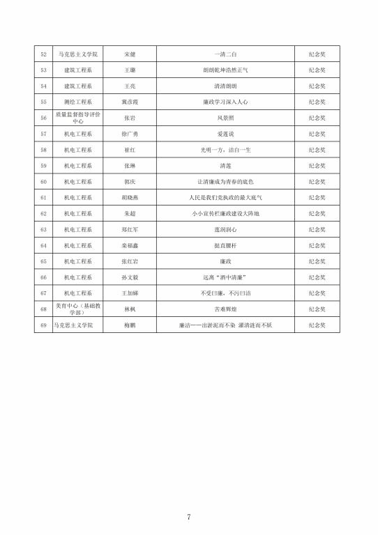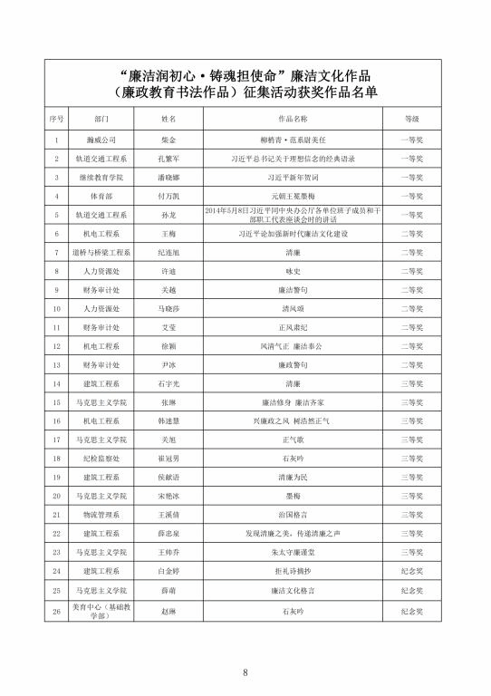征集廉洁文化作品,加强清廉校园建设。面向全校师生开展了“廉心文语”校园征文、“润心话语”视频征集、“清心妙语”创意征集、廉政教育书法、绘画、摄影作品征集活动。活动共征集到作品二百余项。学校纪委组织专家对征集作品进行评比,最终评选出一、二、三等奖作品若干(获奖名单见附件),充分调动了教职工参与廉洁文化建设的主动性、积极性和创造性,在师生中营造浓厚廉洁文化氛围。