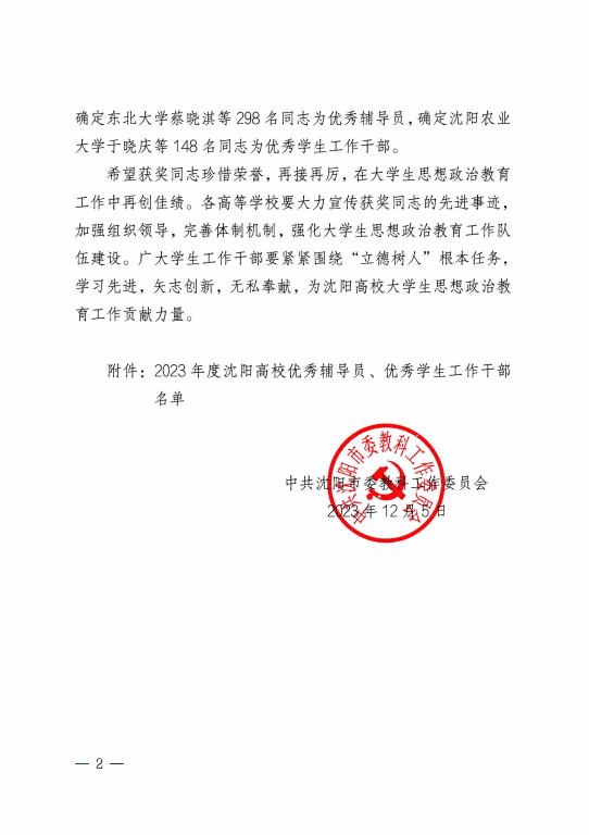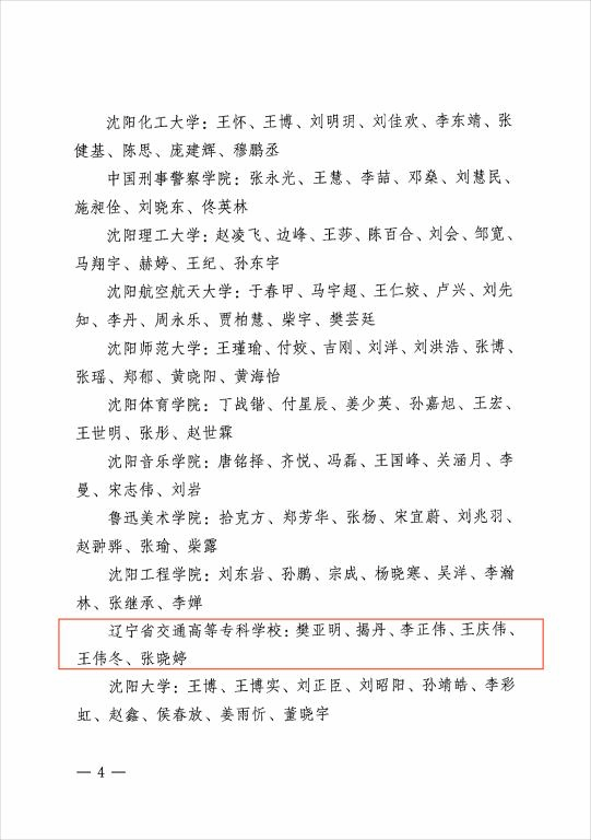 近日,由中共沈阳市委教科工作委员会组织开展的2023年度沈阳高校优秀辅导员和优秀学生工作干部评选活动结果揭晓,我校汽车工程系樊亚明同志、建筑工程系揭丹同志、信息工程系李正伟同志、物流工程系王庆伟同志、测绘工程系王伟冬同志、机电工程系张晓婷同志荣获“2023年度沈阳高校优秀辅导员”称号,学生工作处处长王楠同志、汽车工程系党总支副书记孙影同志、心理健康教研室主任李良敏同志荣获“2023年度沈阳高校优秀学生工作干部”称号。