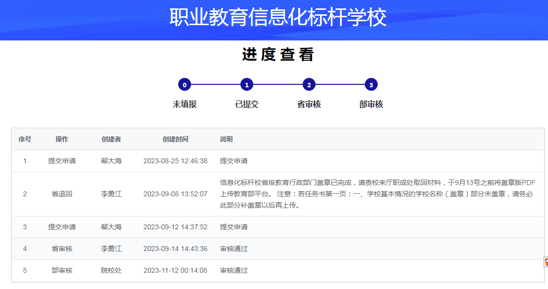 2023年6月,学校获批教育部第一批职业院校数字校园建设试点院校,完成了校本数据中心与教育部职业教育智慧大脑院校中台对接工作,为申报国家职业教育信息化标杆学校奠定了基础。9月,学校申报“职业教育信息化标杆学校”项目,经教育厅审核,教育部评审,正式成为国家职业教育信息化标杆学校建设单位。