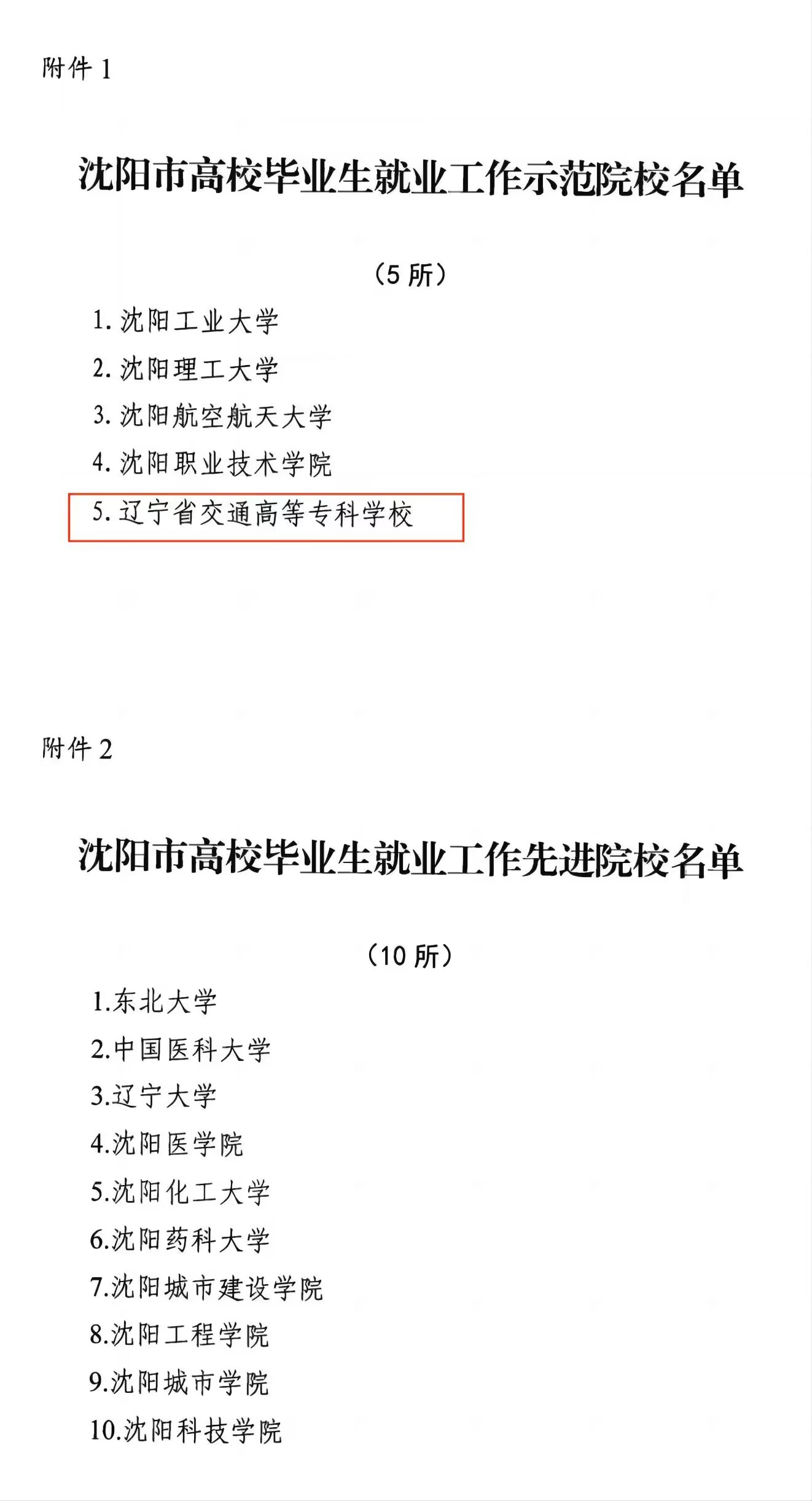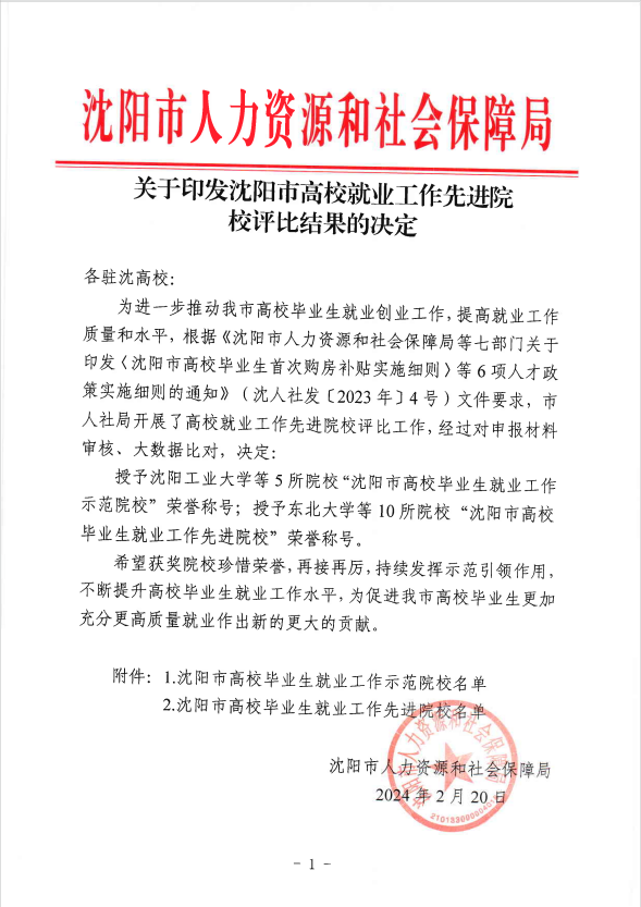 近日,沈阳市人力资源和社会保障局印发了《关于印发沈阳市高校就业工作先进院校评比结果的决定》,共授予5所院校“沈阳市高校毕业生就业工作示范院校”,授予10所院校“沈阳市高校毕业生就业工作先进院校”。我校荣获“沈阳市高校毕业生就业工作示范院校”荣誉称号。