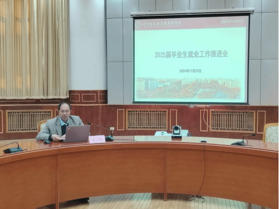 11月22日下午,我校2025届毕业生就业工作推进会在行政办公楼五楼会议室召开。学校全体领导班子成员,各系党总支书记、主任、党总支副书记及负责学生实习工作副主任、专业主任、就业专项辅导员、创就业教育学院全体成员参加了会议。