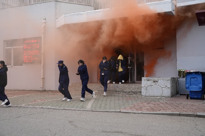 最后,演练进入疏散逃生环节,消防车在学生宿舍区开启消防警报,安全保卫处工作人员指挥参加演练的学生在模拟浓烟中快速有序撤离,同学们用湿毛巾捂住口鼻,弯腰低姿前进,以最快的速度疏散撤离到安全区域。