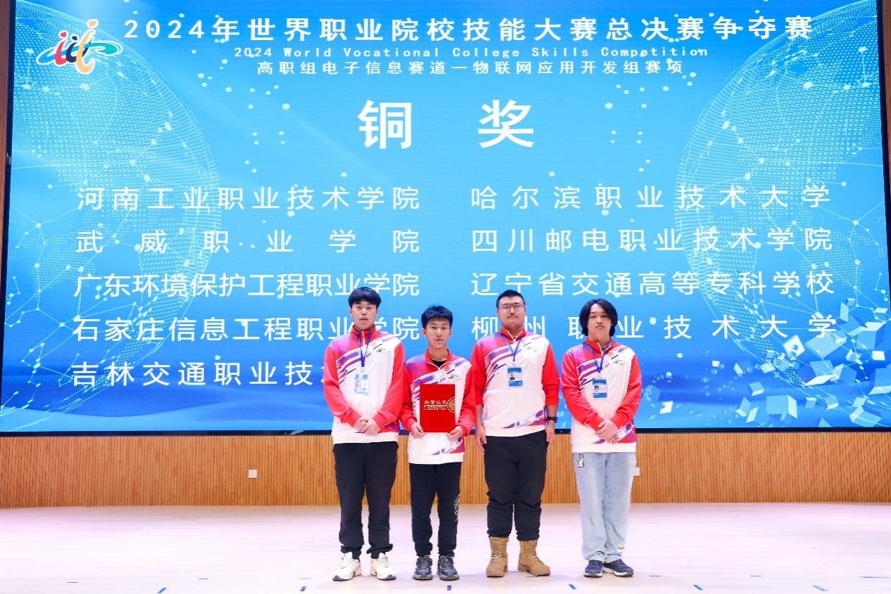 2024年世界职业院校技能大赛总决赛国内组电子信息赛道(一)物联网应用开发赛项于10月28日至10月31日在宁夏职业技术学院举行,共有来自全国32个省、自治区、直辖市的60支参赛队伍参加本次比赛。经过4天的激烈角逐,由我校信息工程系学生王宣霖、朱永昊、黄福岐、付博文组成的参赛团队在徐阳、崔凯老师指导下,代表辽宁省勇获铜奖。