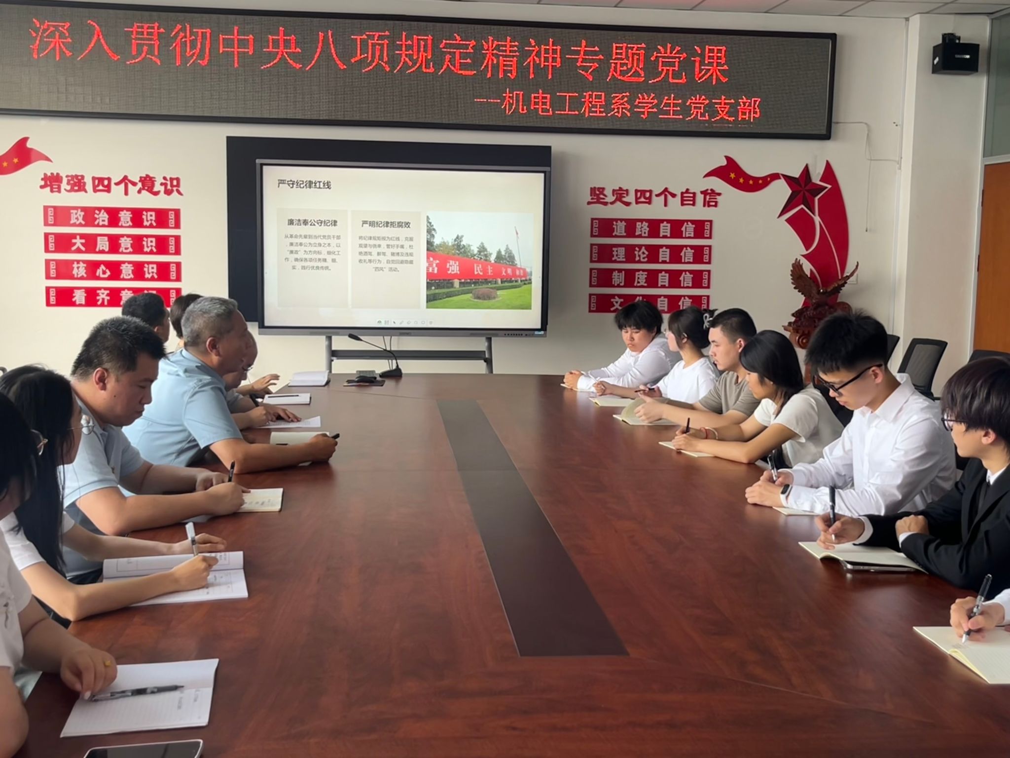 为深化基层党组织作风建设,筑牢青年党员政治思想根基,7月2日,学校副校长张洪革走进机电工程系学生党支部,以“深刻理解中央八项规定精神的时代内涵与实践要求”为题,为支部党员讲授专题党课。