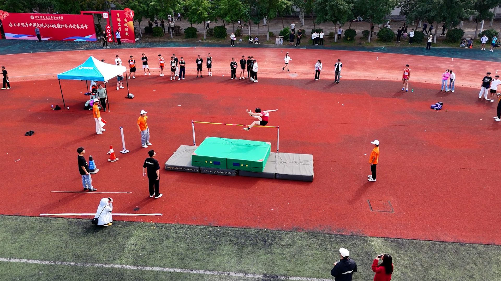 年轻健儿显身手,时代骄子竞风流。在跑道上,发令枪一响,运动员们飞速向前,矫健的身姿在拉拉队的加油声中快速冲过终点。在跳高场地,随着横杆的不断升高,健儿们每一次漂亮的过杆都赢得一阵掌声与喝彩。比赛中,运动员们奋勇争先,努力拼搏,展示着更快、更高、更强的体育精神,他们挥洒着青春的汗水,像跳动的音符在 田径场上弹奏着运动的乐章。广播里不时播出获奖同学的佳绩,各系部踊跃向大会投稿,围观的拉拉队更是激情澎湃,助威声震耳欲聋,此起彼伏。