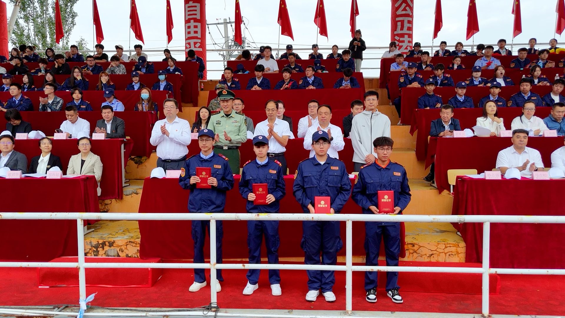 国旗护卫队英姿飒爽、步履铿锵,护送中华人民共和国国旗入场。鲜艳的五星红旗冉冉升起,全场奏唱国歌,大会正式开始。首先进行新生军训汇报表演。受阅队伍由各教学系和警士管理学院推选出的10支优秀专业方队及1支女子方队组成。同学们以洪亮的口号与军姿作礼,精神抖擞、步伐整齐,依次走过主席台接受检阅,那一阵齐过一阵的踏步声,熔铸成青春最完美的交响。由女学员表演的女子匕首操表演,动作整齐、步调一致、精神焕发、意志昂扬,宛如坚不可摧的钢铁长城。由男学员表演的男子刺杀操,以刚劲的姿态、铿锵的动作,把青春的热血与阳刚展现得淋漓尽致。由警士生完成擒敌震脚功擒敌动作表演,如猛虎蓄势、锐气逼人,震脚铿锵稳底盘似惊雷撼地,擒敌干脆显硬功如利刃出鞘。