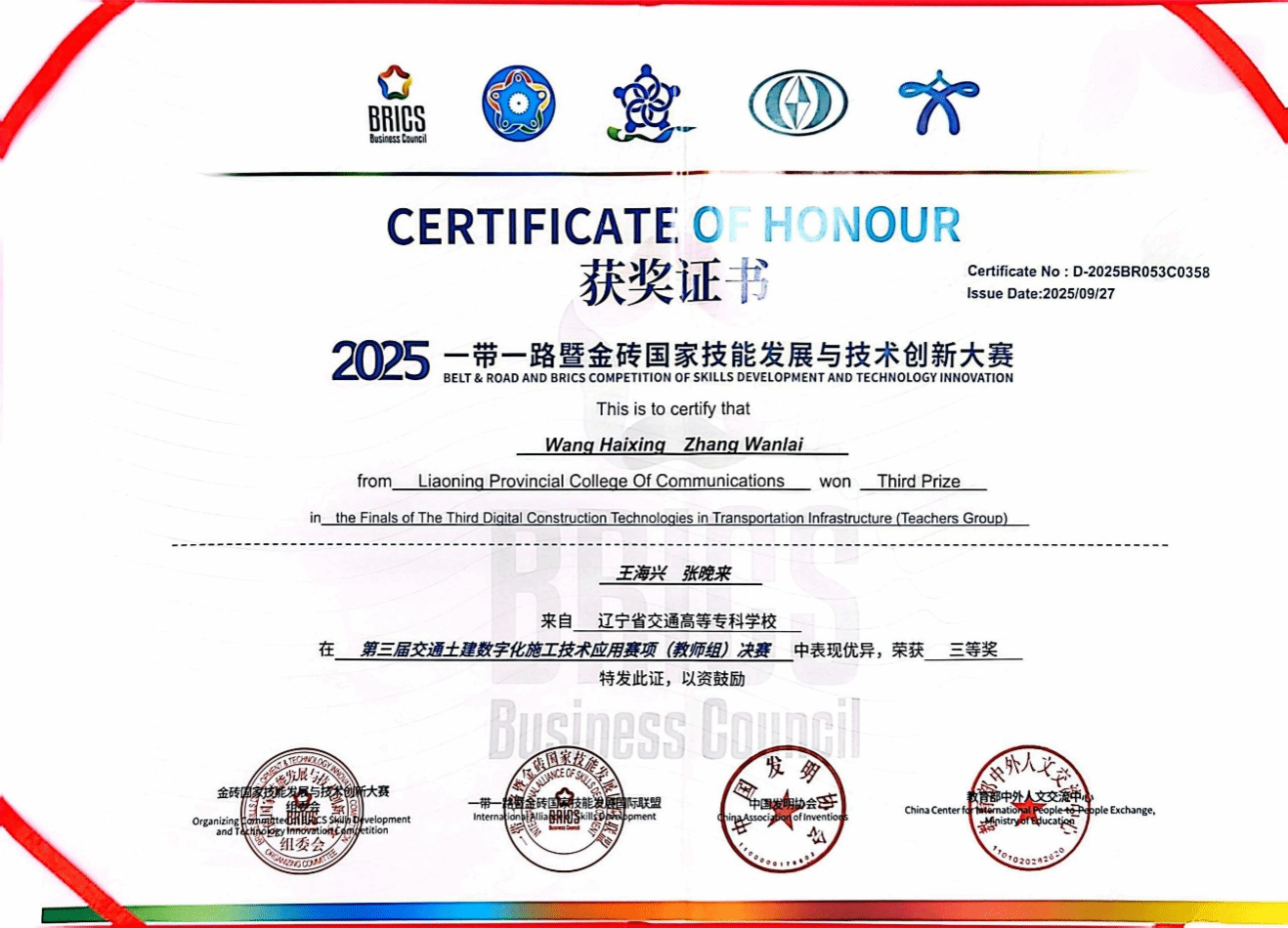 辽宁省交通高等专科学校在2025“一带一路”暨金砖国家技能发展与技术创新大赛之第三届交通土建数字化施工技术应用赛项全国总决赛中获学生组和教师组三等奖