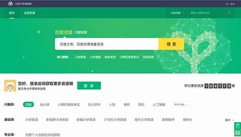 百度文库是全球最大的中文文档分享平台。百度文库高校版为百度文库为高校用户提供服务的专业平台,网址为https://eduai.baidu.com。目前已收录1991年至今逾5亿文档,文档涉及教育、专业资料、实用文档、资格考试等领域。资源覆盖31个主流行业,235个细分资料库。该资源由5000家专业机构与30万认证专业人士提供,在资源的上传端奠定资源的权威性及广度。百度文库高校版更为高校师生提供知识图谱,千人千面的个性化设置等服务,以满足日常工作学习的个性化服务需求。