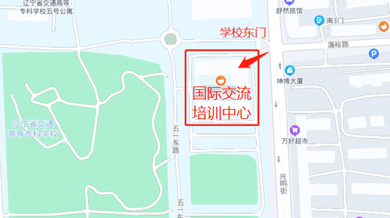 面试及报到地点为辽宁省交通高等专科学校国际交流培训中心(沈阳市沈北新区兴明街)。请面试考生走兴明街(学校东侧)进入国际交流培训中心。方位图如下: