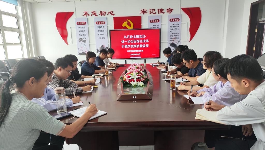 按照学校《关于推动全校基层党组织和广大党员认真学习宣传党的二十届三中全会精神的通知》要求,为进一步学习宣传贯彻党的二十届三中全会精神,抓好党的创新理论武装,提高全体党员马克思主义水平和现代化建设能力,2024年9月11日下午,轨道交通工程党总支开展九月份主题党日活动-“进一步全面深化改革,引领学校高质量发展”。