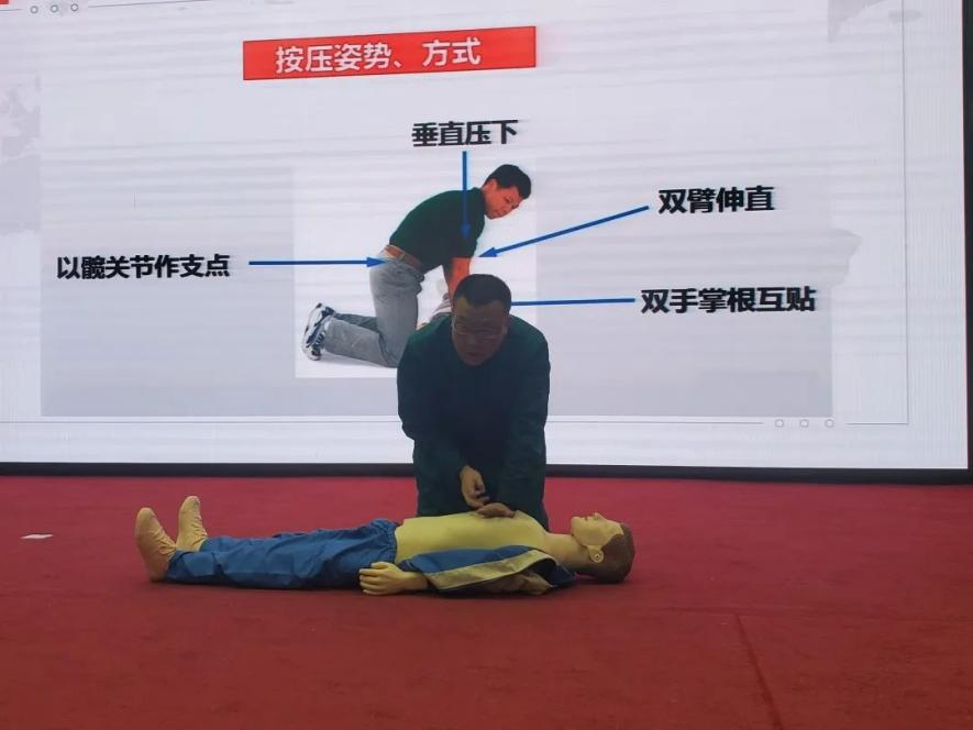 冯学宁主任通过PPT讲解、互动问答、实际操作演示等形式,向同学们演示了成人心肺复苏的相关知识:成人气道异物梗阻、海姆立克急救法、绷带及三角巾的包扎方法、骨折现场的处理等。通过加深同学们对应急技能重要性的认识,我们鼓励大家勇敢面对挑战,及时做好防护措施,拥有健康生活。