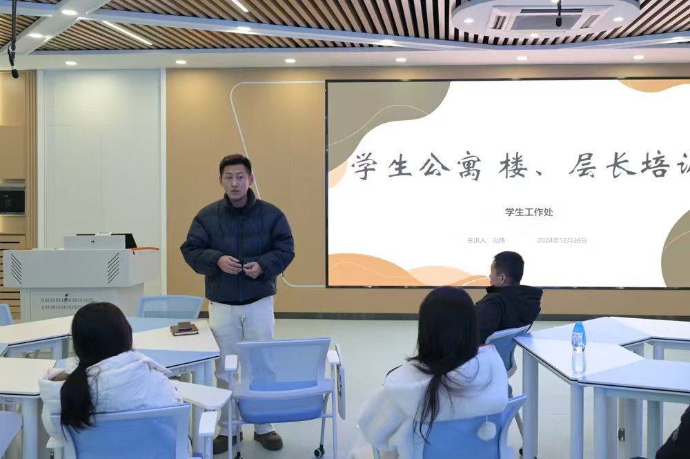 为进一步提升学校学生公寓管理水平,打造更加安全、和谐、有序的学生公寓环境,提升公寓学生干部的管理能力,充分发挥学生干部模范带头作用,畅通公寓管理信息反馈渠道,12月26日,学生工作处在素质教育中心309组织开展学生公寓楼长、层长工作培训。