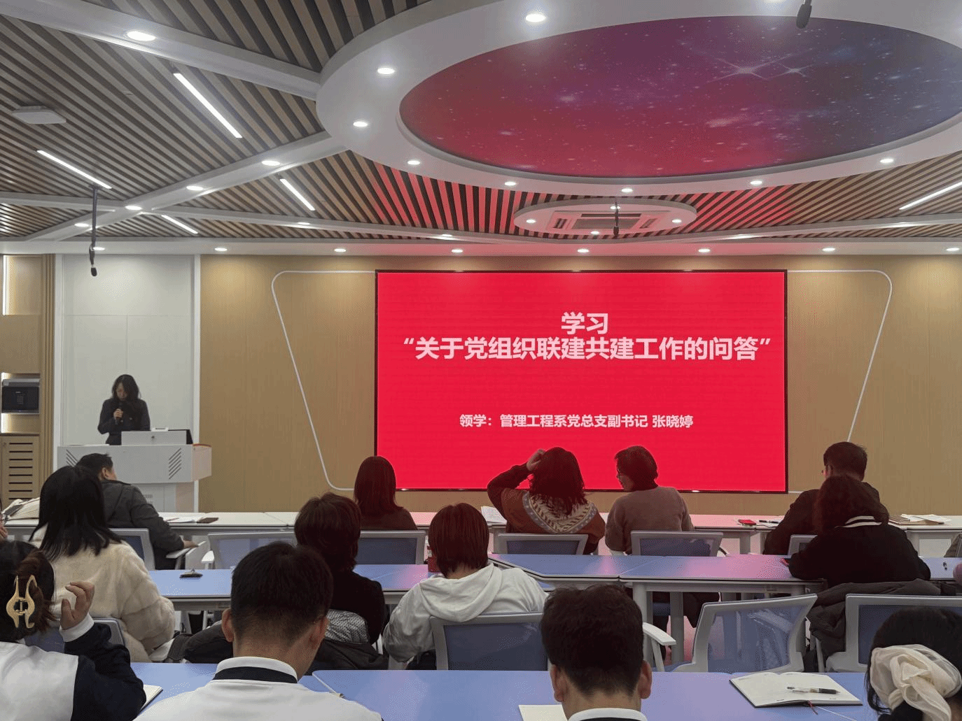 在理论学习环节,物流管理系2024级电子商务专业入党积极分子李可心同学领学《习近平谈治国理政》第五卷中《一步一个脚印把建成科技强国战略目标变成现实》篇目,管理工程系2024级入党积极分子乔梦雨同学领学《朝着建成教育强国目标扎实迈进》相关内容。随后,管理工程系党总支副书记张晓婷领学“关于党组织联建共建工作的问答”,为开展联建共建工作提供了坚实的理论指导和可行的实践参考。