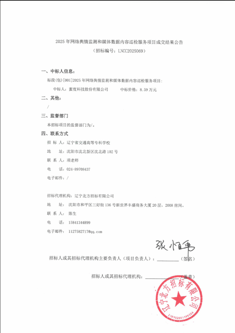2025年网络舆情监测和媒体数据内容巡检服务项目成交结果公告(LNCC2025069)
