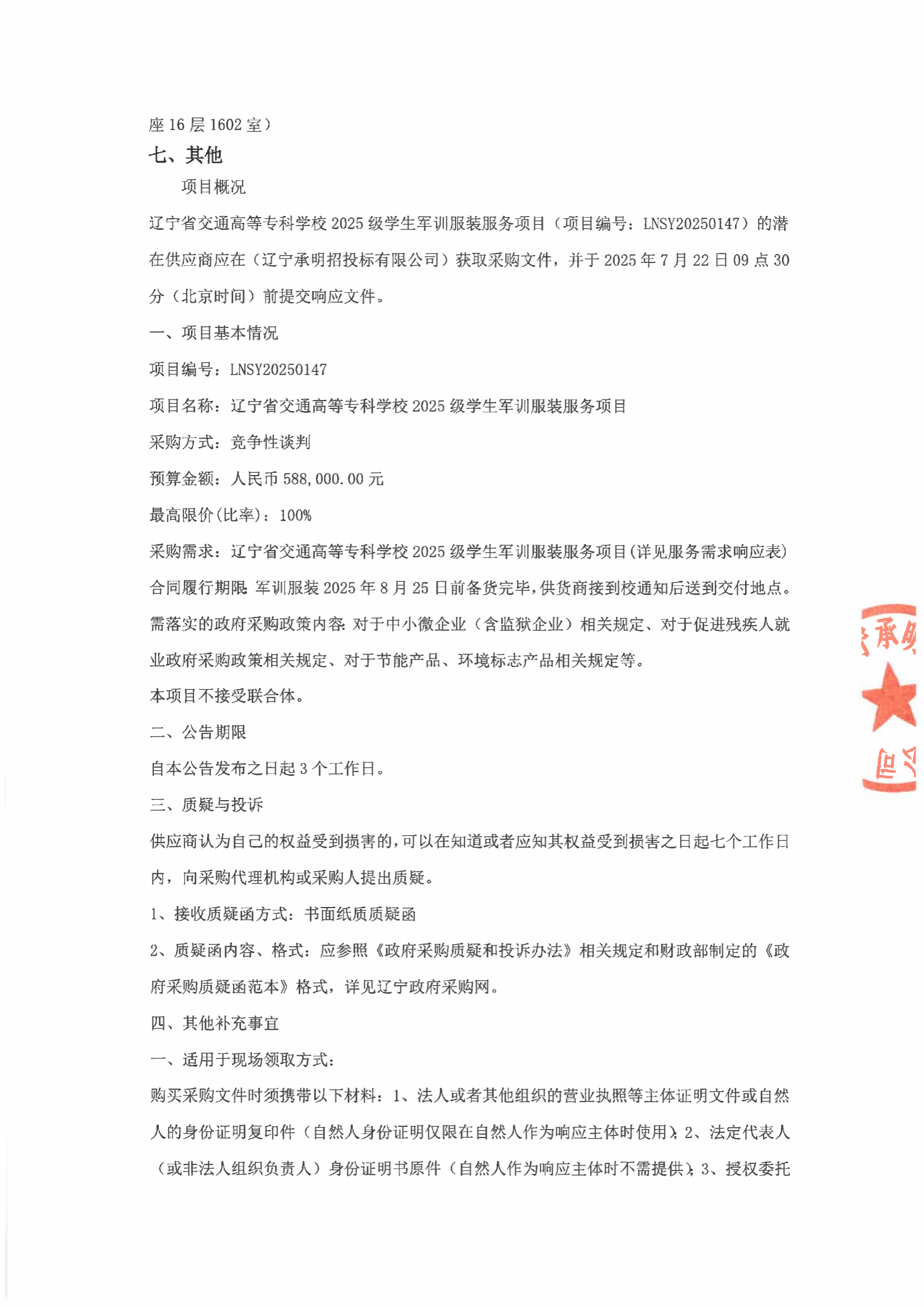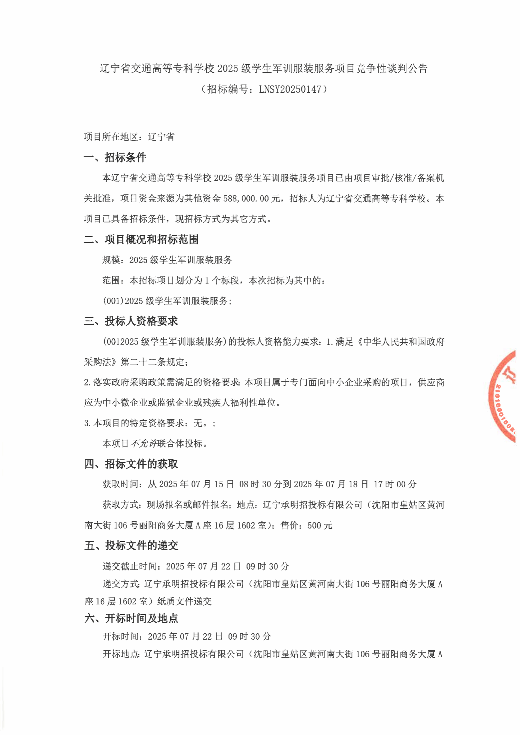 辽宁省交通高等专科学校2025级学生军训服装服务项目竞争性谈判公告(LNCC2025076)