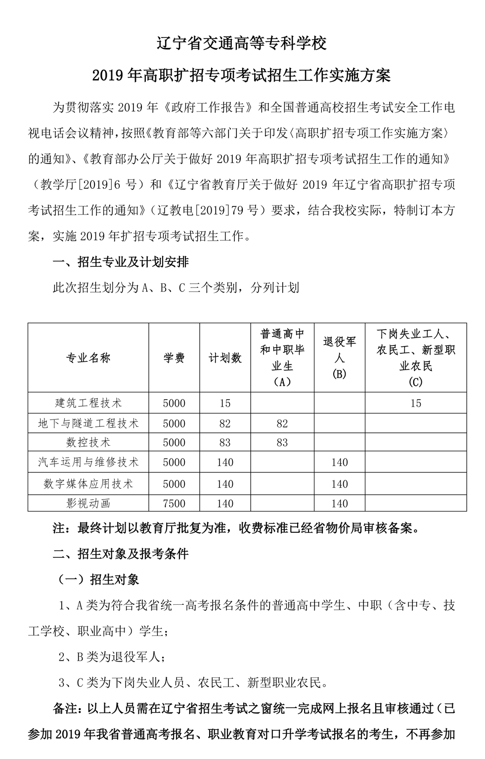 【2019】辽宁省交通高等专科学校2019年高职扩招专项考试招生工作实施方案