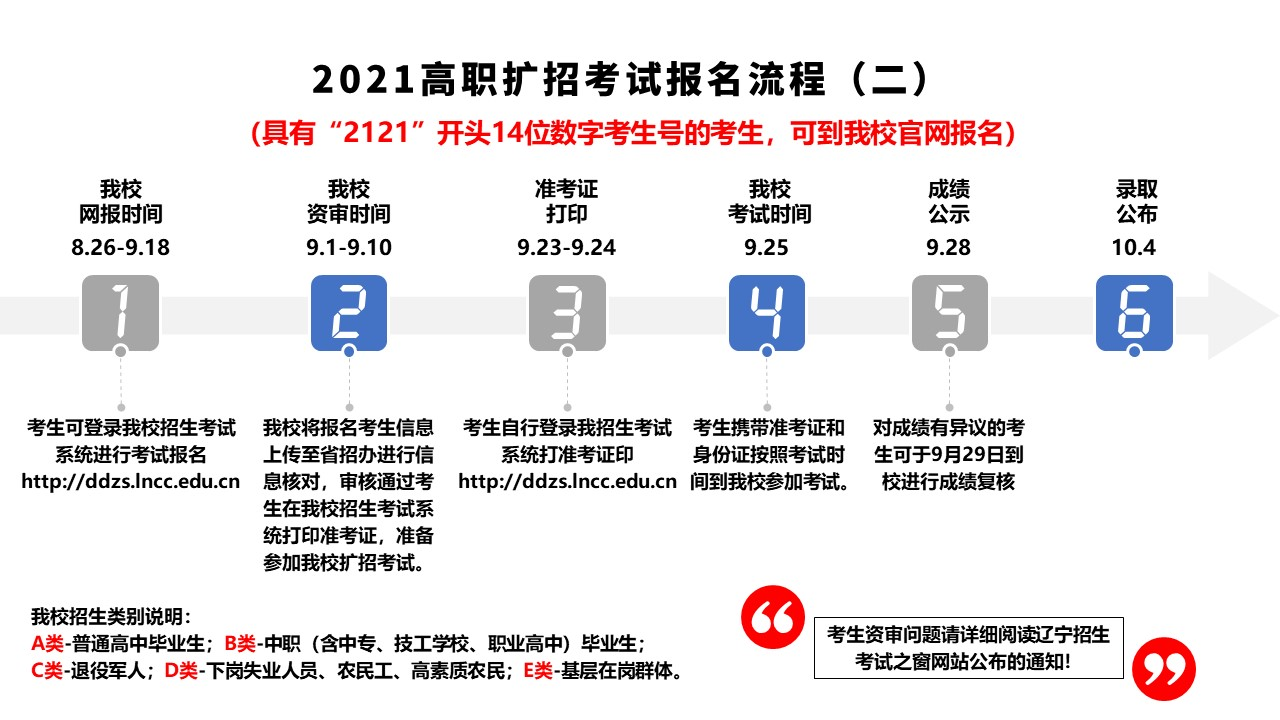 2.未参加2021年高考报名的考生(包括部分A类、B类考生和C类、D类、E类考生),须进行高考补报名,再参加高职扩招(第二阶段高职单招)。